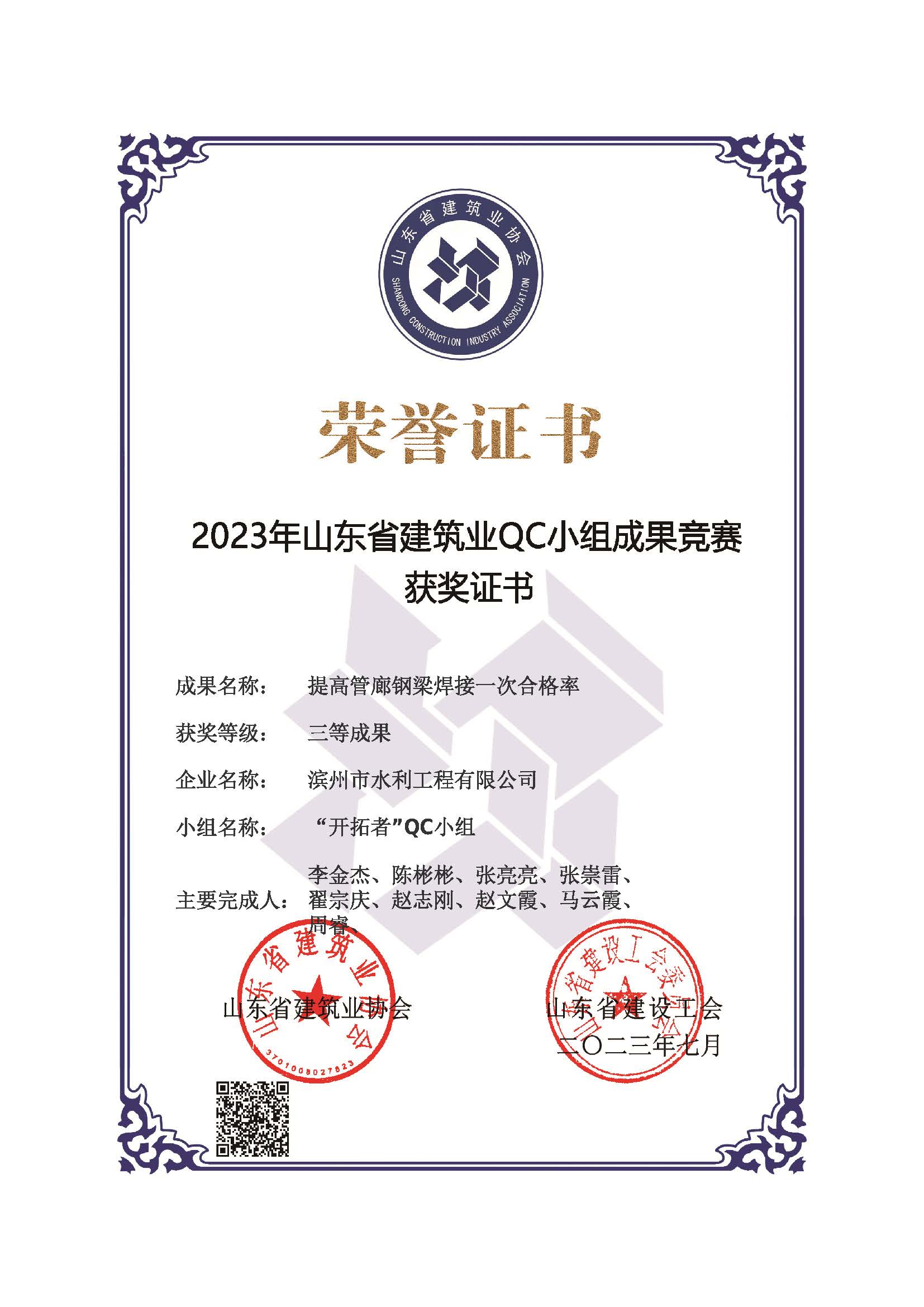 为贯彻党的“二十大”精神,进一步落实《中共中央、国务院关于开展质量提升行动指导意见》和《质量强国建设纲要》总体要求,践行滨州水务发展集团有限公司高质量发展的思路举措,不断增强企业质量和品牌发展能力,激发广大员工参与质量提升和创新的热情,2023年3月在滨州市建筑业协会的择优推荐下,滨州市水利工程有限公司“开拓者QC”小组申报了由山东省建筑业协会和山东省建设工会联合组织开展的2023年度山东省建筑业QC小组成果竞赛活动,并于7月份荣获三等奖。